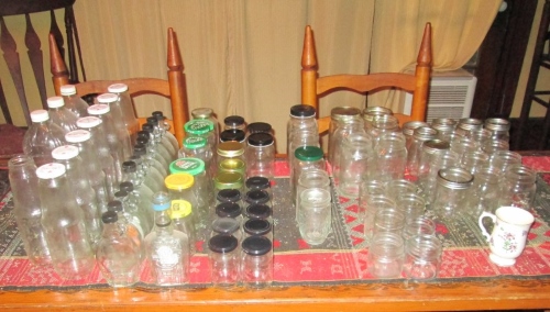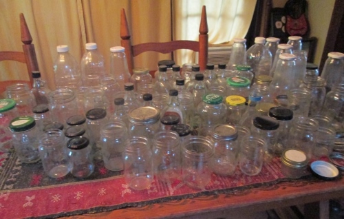 The rest to the right is a mix of Mason jars and generic jars. I threw out all that would not seal with a Mason-style lid (the typical wide or narrow) and kept the rest. The less sturdy (non-Mason-style) jars can be used for dry-canning or foods that do not require pressure-canning.